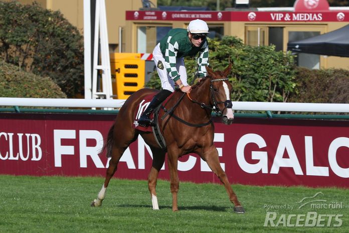 Muskoka am 01.10.2023 beim Renntag in Longchamp. Copyright by Marc Ruehl - Veroeffentlichung nur gegen Honorar (zzgl.MwSt), Namensnennung und Beleg, Bank Routing Number: BIC GENODED1PAF, Bank Account Number: IBAN DE04 3706 2600 1201 6180 17, Steuer-Nr.: 203/5266/0306, Ust_Id_Nr.: De 100281417, Zur Gaulshuette 29, 50181 Bedburg, Phone: +49-(0)2272-83351, www.marcruehl.com, info@marcruehl.com, Speichern in Bilddatenbanken oder Vervielfltigung ist ohne schriftliche Genehmigung nicht gestattet. Fr redaktionelle Nutzung - gegen Honorarzahlung - freigegeben. Bei nicht journalistischer Verwendung bitten wir um Rcksprache